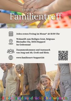 Der FamilienOrt Boppard e.V. veranstaltet jeden 1. Freitag im Monat einen Familientreff. Dieser findet ab sofort im Gedeonsaal des Wohnstift zum Heiligen Geist Belgrano (Rheinallee 55a, 56154 Boppard) statt.
