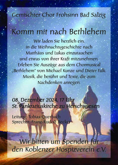 Komm mit nach Bethlehem – der Gemischte Chor Frohsinn Bad Salzig lädt herzlich ein, miteinander in die Weihnachtsgeschichte nach Matthäus und Lukas einzutauchen und etwas von ihrer Kraft mitzunehmen. Erleben Sie Auszüge aus dem Chormusical „Bethlehem“ von Michael Kunze und Dieter Falk. Musik, die berührt und Texte, die zum Nachdenken anregen. Merken Sie sich vor: 8. Dezember 2024, 17 Uhr, St. Pankratiuskirche zu Herschwiesen.