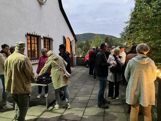 Beim Weinlaubenfest im Oktober bot das Team der "Genießerstube" seinen Gästen neben den klassischen Schnittchen als Highlight einen leckeren Zwiebelkuchen an, zu dem natürlich der entsprechende Federweiße nicht fehlen durfte. Der von unserem einheimischen Bäcker Bruno Volk gebackene Zwiebelkuchen wurde von den Gästen sehr stark nachgefragt und der leckere Geschmack besonders gelobt. Aufgrund der angenehmen Herbsttemperaturen wurde von den Besuchern nicht nur der Innenraum der Evangelischen Kapelle genutzt, ein großer Teil verweilte bis zum Schluss um 21:00 Uhr an den Stehtischen auf dem Vorplatz.
