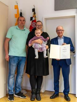 Stadt Boppard - Die kleine Liliana Melia Schneider hat einen ganz besonderen Ehrenpaten: Im Bürgermeisterbüro überreichte Bürgermeister Jörg Haseneier (rechts) ihren Eltern Manuela und Andreas Schneider stellvertretend für Bundespräsident Frank-Walter Steinmeier eine Urkunde über die Ehrenpatenschaft des Bundespräsidenten.