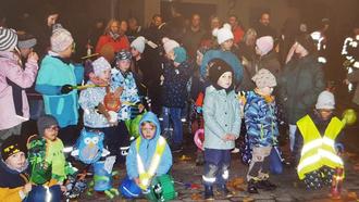 Die Laternen der Kinder konnten in voller Pracht leuchten als die Veranstaltung mit einem Video über die Martinsgeschichte eröffnet wurde. Anschließend folgten die Zugteilnehmer dem imposanten Reiter mit seinem Pferd und der Musikkapelle des Musikvereins. Die Zugsicherung übernahmen die Kameraden der Feuerwehr, die auch das Feuer entfachten und die Gäste mit Glühwein und Würstchen beköstigten.
