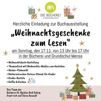 Das Team der Bücherei St. Ägidius freut sich auf viele Besucher am Sonntag, 17. November von 13 bis 17 Uhr in der Bücherei und der Grundschul-Mensa. Neben der Buchausstellung und einem Thementisch mit Weihnachtsmedien zum Ausleihen warten ein Bücherflohmarkt, Vorlesen und Basteln für Kinder sowie Kaffee und Kuchen. Herzliche Einladung.