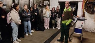 Hier lagern die modernen Tanks, in denen der neue Wein klimareguliert heranreift. Winzer Jonas Schöneberger hatte für die Gruppe einen Begrüßungsschluck Traubensaft bereitgestellt, der von den Schülerinnen und Schülern mit Begeisterung probiert wurde.