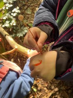 Für Staunen sorgte auch der orange milchende Helmling, ein Pilz, der bei Verletzung eine auffällig gefärbte Flüssigkeit absondert. Die Kinder waren fasziniert von der leuchtend orangefarbenen Milch – und besonders begeistert, dass sie sich damit sogar kleine Muster auf die Hand malen konnten. Ein echtes Naturerlebnis zum Anfassen!