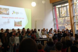 Begrüßt wurden die Besucher von der Schulleiterin der IGS Kornelia Neumann, der neuen Orientierungsstufenleiterin Kerstin Werner, und von den Kindern der jetzigen fünften Klassen, die mit einem zum Mitsingen einladenden Begrüßungslied und Blasmusik auf den gemeinsamen Samstagvormittag einstimmten.