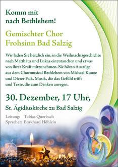BAD SALZIG. Der Gemischte Chor Frohsinn Bad Salzig lädt herzlich ein mitzukommen, nach Bethlehem. Das Chorkonzert findet statt am 30.12.2022, 17:00 Uhr in der St. Ägidiuskirche zu Bad Salzig. Dargeboten werden Auszüge aus dem Chormusical Bethlehem von Michael Kunze und Dieter Falk. Sie hören Musik, die das Gefühl trifft und Texte, die zum Denken anregen.