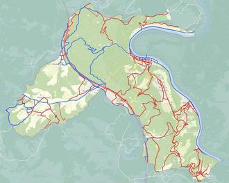 Das Zielnetz nach dem Radverkehrskonzept der Stadt Boppard. Die blaue Linie zeigt den Bestand, die blau-unterbrochene Linie zeigt die Planung. Die rote Linie stellt das Zielnetz dar, rot-unterbochen die Zielnetz Alternative. Grau eingefärbt sind Abschnitte außerhalb des Stadtgebiets.