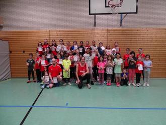 Auf dem Bild ist ein Teil der zweiten und dritten Trainingsgruppe zu sehen, die ihr Sportabzeichen 2024 abgelegt haben. Die Übungsleiter Sebastian und Michael Gröning werden bei dieser Aufgabe durch Helferinnen, die in der letzten Reihe links stehen, tatkräftig unterstützt.