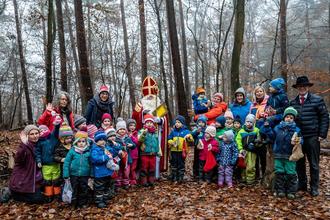 In seinem großen Jutesack brachte der Heilige die Nikolaussocken der Kinder, die er zuvor mit allerlei schönen Gaben gefüllt hatte, mit in das angrenzende Waldgelände, wo sich die Kinder mit Kindergartenleiterin Gabriele Seeger und ihren Erzieherinnen bereits versammelt hatten.