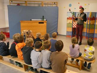 Mit Zaubertricks, bei denen die Kinder auch mitzaubern durften, vermittelte er den Kindern das richtige Verhalten im Straßenverkehr - beispielsweise, wo Kinder als Mitfahrer im Auto sicher aufgehoben sind und wie sie sich am Zebrastreifen oder an der Ampel richtig verhalten. Spannende Themen, bei denen die Kinder auf spielerische Art viel erfahren haben.