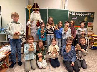 Große Aufregung und gespannte Vorfreude lagen am 08.12.25 in der Luft der Grundschule Buchholz. Es war wieder soweit: Der Nikolaus hatte sich angekündigt! Mit strahlenden Augen warteten die Kinder in ihren Klassenräumen, als plötzlich ein feierliches Klingeln die Stille durchbrach. Groß war das Staunen, als der Nikolaus höchstpersönlich, in sein prächtiges Gewand gehüllt und begleitet von seinem fleißigen Helfer, die Klassentüren öffnete und den Klassenraum betrat – ein Moment, der die Augen der Kleinen sofort zum Leuchten brachte.