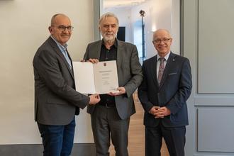 Das Museum Boppard ist Museum des Monats: Staatssekretär Prof. Dr. Jürgen Hardeck (Mitte) überreichte die Urkunde im Beisein von Boppards Bürgermeister Jörg Haseneier (rechts) an Museumsleiter Frank Schröder.