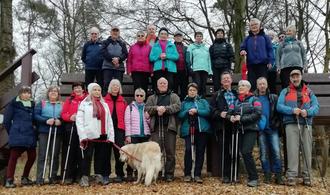 Nun wanderte die Gruppe im Schnellbachtal hinauf bis zum Hexenfelsen. Hier war ein kurzer, aber knackiger Aufstieg zu bewältigen. Über bequeme Waldwege erreichten die Teilnehmer den Höhenrücken südlich von Bickenbach, wo die XXL-Bank montiert ist. Das neblige Wetter beeinträchtigte leider den Ausblick über den Vorderhunsrück. Zum Abschluss kehrten die zufriedenen Wanderer in einem Gasthaus in Bickenbach ein.