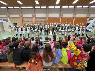Gebannt schauten alle Kinder den dann folgenden und tollen Tanzvorführungen der `Zinnis` und `Minis` zu, -eine großartige Leistung nach monatelanger Arbeit mit den zuständigen Trainerinnen und Trainern. Als kleines Dankeschön gab es für alle Auftretenden Süßigkeiten und den schuleigenen Karnevalsorden.