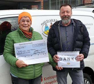 Oliver Follmann, Geschäftsführer der Moog Rekofa GmbH, und die Vorsitzende des Markts für Leib und Seele, Christa Terzer-Rösner, bei der Spendenübergabe.