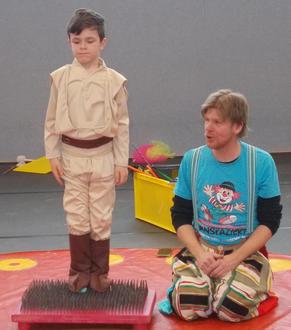 Clown Nils erklärte, wie man richtig auf einem Fakirbrett stehen muss.