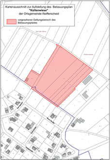 Der Ortsgemeinderat Reifferscheid hat am 25.07.2023 weiterhin beschlossen, dass über die beabsichtigte Aufstellung des Bebauungsplanes "Kollenwiese" für das oben angeführte Gebiet mit der Öffentlichkeit eine öffentliche Unterrichtung über die allgemeinen Ziele, Zwecke und Auswirkungen der Planung gemäß § 3 (1) BauGB durchgeführt wird.