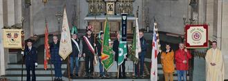Die Fahnenträger der anwesenden Vereine und Pfarrer Dr. Rainer Justen (r.).