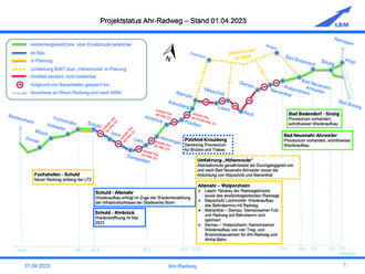 Insgesamt muss im Bauverlauf mit kurzfristigen Sperrungen und Umleitungen gerechnet werden, über die der LBM, die Kommunen und die Tourismusorganisationen regelmäßig bspw. auf ihren Internetseiten informieren werden. Seitens des Ahrtal Tourismus wird zusätzlich eine entsprechende Informationsbroschüre zu Umfahrungen und Alternativrouten für den Radtourismus erstellt. Link zum Wiederaufbau-Plan für den Ahr-Radweg: https://lbm.rlp.de/de/wiederaufbau-ahrtal/