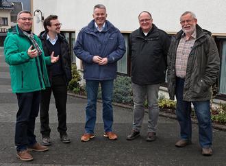 Die CDU-Delegation machte sich ein Bild vom Wiederaufbau. v.l.: MdL Horst Gies, Gemeindeverbandsvorsitzender Michael Korden, Fraktionsvorsitzender Gordon Schnieder, Guido Nisius, Bürgermeister der Verbandsgemeinde Adenau und Udo Stratmann, Ortsgemeinde Dümpelfeld