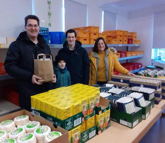 ADENAU. Auch in diesem Jahr packte die Familie Böhle aus Adenau fleißig die von ihr gespendeten Weihnachtstüten. Die Tüten mit Lebensmitteln, die sonst selten oder gar nicht den Weg zum Markt für Leib & Seele finden, wie zum Beispiel Wiener Würstchen, Camembert, Kaffee oder Salami, werden bei der letzten Lebensmittelausgabe vor dem Weihnachtsfest an die Kund*innen verteilt. Vorsitzende Christa Terzer-Rösner: „Da schaut jedes Jahr das Christkind bei uns vorbei.“ Der Verein dankt Familie Böhle für die großzügige Spende, die ein Lächeln auf die Gesichter der Kunden und Mitarbeiter*innen zaubert.