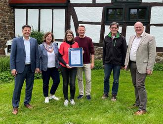 Christoph Eßer-Ayertey (RAL), Marion Wamig (Tourist Info Adenau), Stephanie Pannhausen, Rolf Pannhausen, Peter Richrath (Ortsbürgermeister Antweiler), Guido Nisius (Bürgermeister Verbandsgemeinde Adenau) freuen sich über die Ecolabel- Zertifizierung (v. l.)