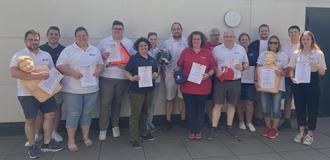 Bevor die 14 Ehren- und Hauptamtlichen allerdings ihr Zertifikat in den Händen halten konnten, hieß es büffeln. Zunächst drehte es sich in 16 Online-Unterrichtseinheiten unter anderem um Didaktik, Kommunikationsgrundlagen oder um medizinische Hintergründe der Ersten Hilfe. Erst nach bestandenem Abschlusstest wurden sie für den fünftägigen Lehrgang in Präsenz zugelassen. Hier wurden beispielsweise die Rolle der Lehrkraft, Rhetorik oder Seminarstrukturierung erörtert und geübt. Darüber hinaus standen zahlreiche Unterrichtsbeispiele der Ersten-Hilfe-Ausbildung auf dem Lehrplan. Nach einer schriftlichen Prüfung, einer praktischen Lernerfolgskontrolle und einem Beurteilungsgespräch stand fest: alle 14 ehren- und hauptamtlichen DRKler haben bestanden. Sie sind nun Ausbilderinnen bzw. Ausbilder in Erster Hilfe und dürfen nach dem Absolvieren einer Praxisphase Erste-Hilfe-Kurse oder Aus- und Fortbildungen für Betriebshelfer eigenständig leiten.