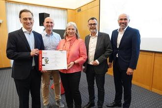 Die Ideen und Konzepte junger Studenten der Internationalen Hochschule für zukunftsfähigen Tourismus im Ahrtal begleiteten (v.l.) Prof. Dr. David Rempel, Prof. Dr. Felix Wölfle, Prof. Dr. Margit Bölts und Prof. Dr. Peter Neumann, die KSK-Vorstand Guido Mombauer begrüßte.