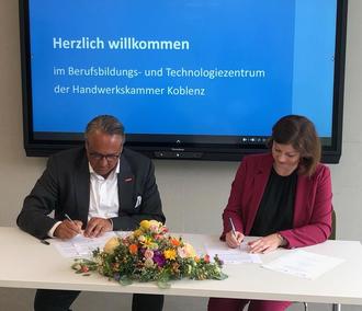 Staatssekretärin Nicole Steingaß und der Hauptgeschäftsführer der HwK Koblenz, Ralf Hellrich, unterzeichnen den Kooperationsvertrag