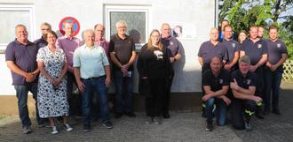 Vertreter von Rat und Feuerwehr mit den Eltern von Katharina (Bildmitte) bei der Gedenkfeier am Feuerwehrhaus.