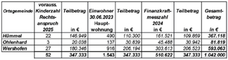Die Investitionskostenumlage 2024 wird gemäß § 8 Abs. 2 der Verbandsordnung des Kindergartenzweckverbandes Armuthsbachtal auf 1.042.000 € festgesetzt und wie folgt auf die Mitgliedsgemeinden verteilt: