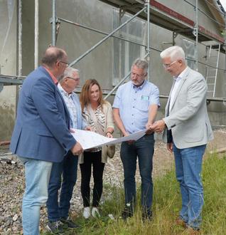 Guido Nisius (l. / Verbandsvorsteher des Zweckverbandes Sozialstation Adenau-Altenahr), Jürgen de Temple (2.v.l. / Stellvertretender Verbandsvorsteher des Zweckverbandes Sozialstation Adenau-Altenahr), Martina Romes (mi. / Künftige Leitung der Tagespflege in Liers), Uwe Szymanski (2.v.r. / Leiter der Sozialstation Adenau-Altenahr) und Dominik Gieler (/ Stellvertretender Verbandsvorsteher des Zweckverbandes Sozialstation Adenau-Altenahr) beim gemeinsamen Austausch vor der annähernd fertiggestellten Tagespflegeeinrichtung in Liers. Nun fehlt nur noch ein passender Name.