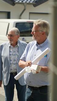 Mit prüfendem Blick und Bauplänen in der Hand begutachten Jürgen de Temple (l. / Stellvertretender Verbandsvorsteher des Zweckverbandes Sozialstation Adenau-Altenahr) und Uwe Szymanski (r. / Leiter der Sozialstation Adenau-Altenahr) die Fortschritte auf der Baustelle.
