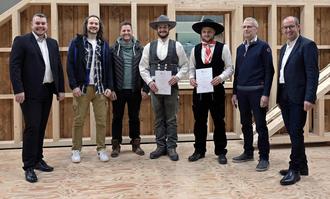 PHOTO DRESCHERSTannenweg 6 Mueschmobil 0163 5504994 - v. l.: Jonathan Jütte, Tobias Lanzerath & David Lanzerath (Geschäftsführer Lanzerath Bau GmbH), Leon Hupperich (Prüfungsbester Baugewerks-Innung Maurer), Johann Fuhrmann (Prüfungsbester Baugewerks-Innung Zimmerer), Achim Holbach (Geschäftsführer Schreinerei Holbach), Jürgen Schneider (Stellv. Obermeister Baugewerks-Innung Kreis Ahrweiler)