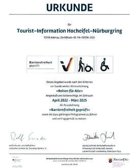 Die Tourist-Information Hocheifel-Nürburgring hat sich auf die Bedürfnisse von Gästen mit Handicap eingestellt und erhielt erstmalig im Jahr 2018 das Siegel „Reisen für Alle - Barrierefreiheit geprüft“ für ihren besonderen Einsatz. Im April 2022 wurde die Tourist-Information Hocheifel-Nürburgring nun erneut mit diesem Siegel ausgezeichnet. Ausgestellt wurde das Gütezertifikat von der Rheinland-Pfälzischen Wirtschaftsministerin Daniel Schmitt.