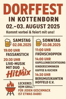 Wer sich als Kottenborner noch für das Fest einbringen möchte, gerne. Es werden noch Kuchenspenden sowie helfende Hände beim Auf- und Abbau benötigt, bitte meldet euch zur Abstimmung für Kuchen bei Irmgard Jüngling. Der Dienstplan mit Auf- und Abbauzeiten sowie Dienste hängt im Aushangkasten. Natürlich sind wir auch für jede andere Form der Unterstützung dankbar.