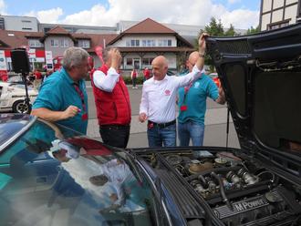 Volker Strycek (Mitte) bei „Benzingeflüster“ mit Teilnehmern der AvD Histo-Tour