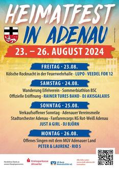 Den Abschluss aus Sicht der Vereine bildet am Montag, 26. August, um 18.30 Uhr der MGV Adenauer Land. Dieser bietet im Atrium der kath. Pfarrkirche ein „Offenes Singen“ an, das sich in den letzten Jahren wachsender Beliebtheit erfreute.