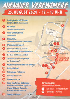 Mit dabei mit Präsentationen entlang der Hauptstraße sind in diesem Jahr die Pfadfinder, die Geno Eifel, der Förderverein Sozialstation Adenau-Altenahr mit dem Pflegestützpunkt und der Gemeindeschwesterplus, der SSF Bonn/Irish Dance Leimbach, die Suchhunde und Kitzrettung Adenau am Nürburgring, die Katzenschutzfreunde Rhein-Ahr-Eifel, der Helferstab Ahrtal, der TuWi Adenau mit der Abteilung Voltigieren, die Freiwillige Feuerwehr, der DRK Ortsverein Adenau, der Rotary Club Adenau-Nürburgring, die Rollende Waldschule der Jägerschaft, die Original Goldbach-Musikanten, der Markt für Leib und Seele und das Jugendcafé Adenau.