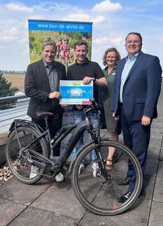 Bei der diesjährigen Tour de Ahrtal hat Carsten Thelen den Hauptpreis gewonnen. Landrat Markus Ramers (l.), Udo Becker (r.), KSK-Vorstandsvorsitzender und Svea Kiesel vom Orga-Team gratulierten dem Gewinner.