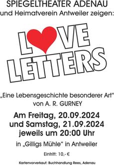„Love Letters“ von A. R. Gurney ist eine Lebens- und Liebesgeschichte der besonderen Art. Das Stück handelt von einem Mann und einer Frau, die sie sich von der zweiten Klasse an ihr ganzes Leben lang Briefe schreiben - zwei Menschen, die nicht mit und nicht ohne einander leben können.