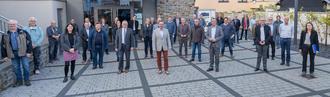 SGD-Nord-Präsident Wolfgang Treis (M.) und Landrätin Cornelia Weigand (r.) bei einer Sitzung der Hochwasserpartnerschaft in Lantershofen.