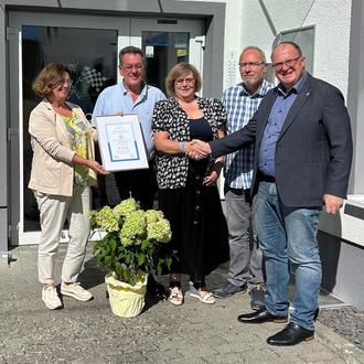 Guido Nisius, Bürgermeister der Verbandsgemeinde Adenau, Klaus Speicher, Ortsbürgermeister der Ortsgemeinde Meuspath und Marion Wamig von der Tourist-Information gratulierten Familie Boden zur erfolgreichen Auszeichnung.