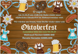 Am 04. Oktober 2025 bei den „Maltesern“ in der Gartenstraße. Beginn: 13:00 Uhr mit dem gemeinsamen Fassanstich und Musik. Verbringen Sie ein paar schöne Stunden mit dem Seniorenteam Waltraud und Renate. Bitte um sofortige Anmeldung wird gebeten, unter: Tel. 02695-840