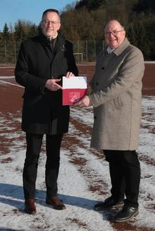 Innenminister Michael Ebling hat dem Bürgermeister der Verbandsgemeinde Adenau Guido Nisius, einen Förderbescheid in Höhe von 986.000 Euro aus dem Sondervermögen „Aufbauhilfe 2021“ überreicht. Gefördert wird die Wiederherstellung eines Spielfeldes im Eifelstadion Adenau.