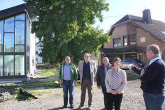 Hauseigentümer Udo Breuer erläutert Steingaß, Neiß, Nisius und Weimer den modernen Wiederaufbau seines Hauses.