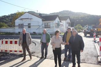 VG-Bürgermeister Guido Nisius, Thomas Weimer, Leiter des Verbindungsbüros der Landesregierung im Ahrtal, Staatssekretärin Nicole Steingaß, Beigeordneter Gerd Stappen und Ortsbürgermeister Ewald Neiß blicken auf den Straßenbau.