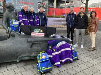 Thomas Brost, Einsatzleiter der Notfallseelsorge am Nürburgring (3. v. l.), freut sich gemeinsam mit den Mitgliedern der Notfallseelsorge und Patrick Ley, Westenergie-Kommunalmanager (2. v. r.), über die neue Arbeitskleidung.
