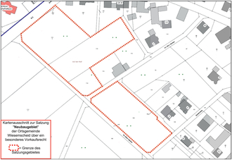 An den im Geltungsbereich dieser Vorkaufsrechtssatzung liegenden Grundstücken steht der Ortsgemeinde Wiesemscheid zur Sicherung einer geordneten städtebaulichen Entwicklung ein besonderes Vorkaufsrecht gemäß § 25 Abs. 1, Satz 1, Nr. 2 Baugesetzbuch (BauGB) zu.