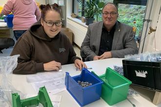 Sarah Schomaker zeigt Guido Nisius die Aufgaben im Arbeitsbereich Montage und Verpackung der Caritas Werkstätten in Adenau.